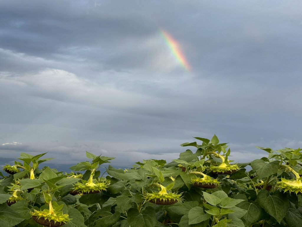 北杜市明野町で行われていたフラワーフェスの開催地でひまわりの収穫を行いました! 明野のひまわり畑の一部に鶏糞を使っていただいています。そこで種を鶏に食べさせることで循環システムができないかと模索中です。 作業途中にきれいな虹も見ることができました。